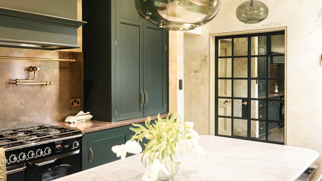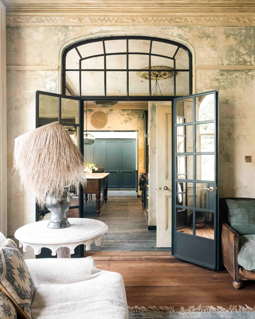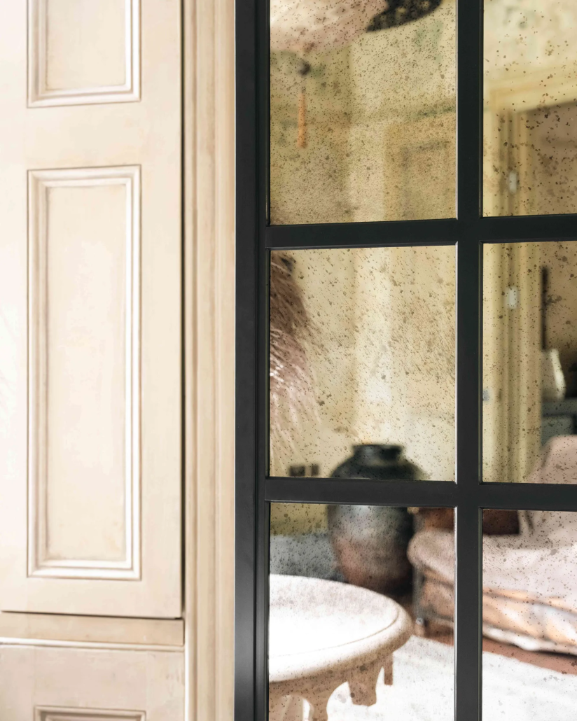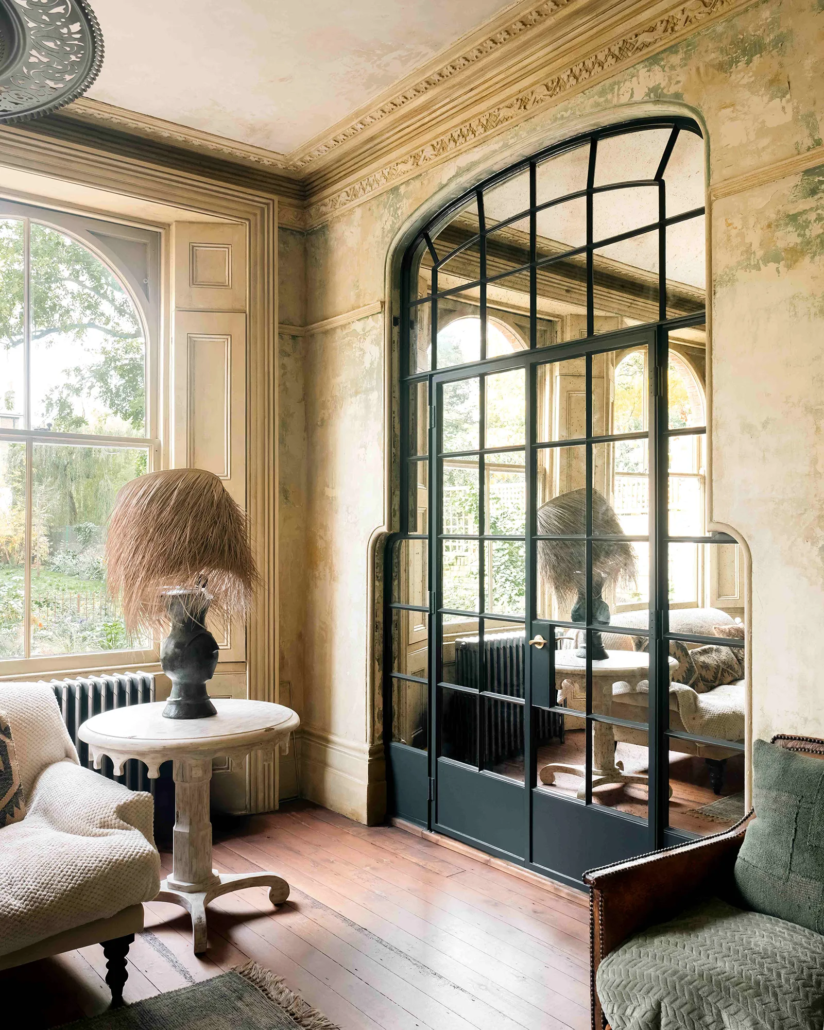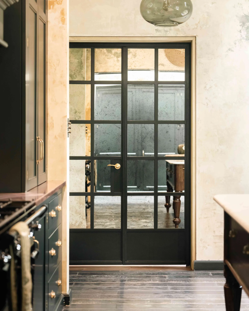 Central to this transformation is the bespoke steel glazing by Fabco, which forms the architectural focal point of the ground floor. Rather than conventional glazing, the installation incorporates antique mirrored glass, allowing the new double doors to integrate seamlessly with the property’s hand-distressed walls and original Victorian features.