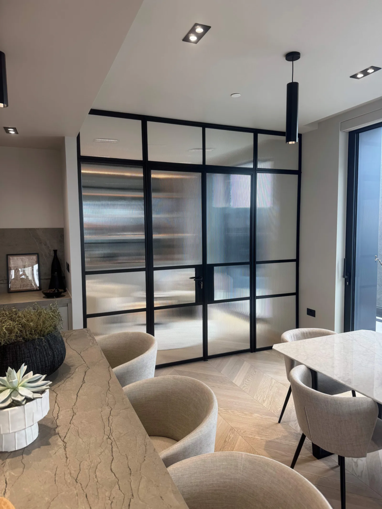 Govette Windows Ltd manufactured the internal screens using W20 hot-rolled steel sections. This highly versatile system offers a range of profile types suitable for fixed glazing, external door frames, door leaves, glazing bars, and coupling bars. The screens were site-glazed using 4 mm narrow reeded toughened safety glass.