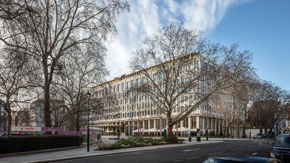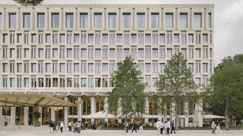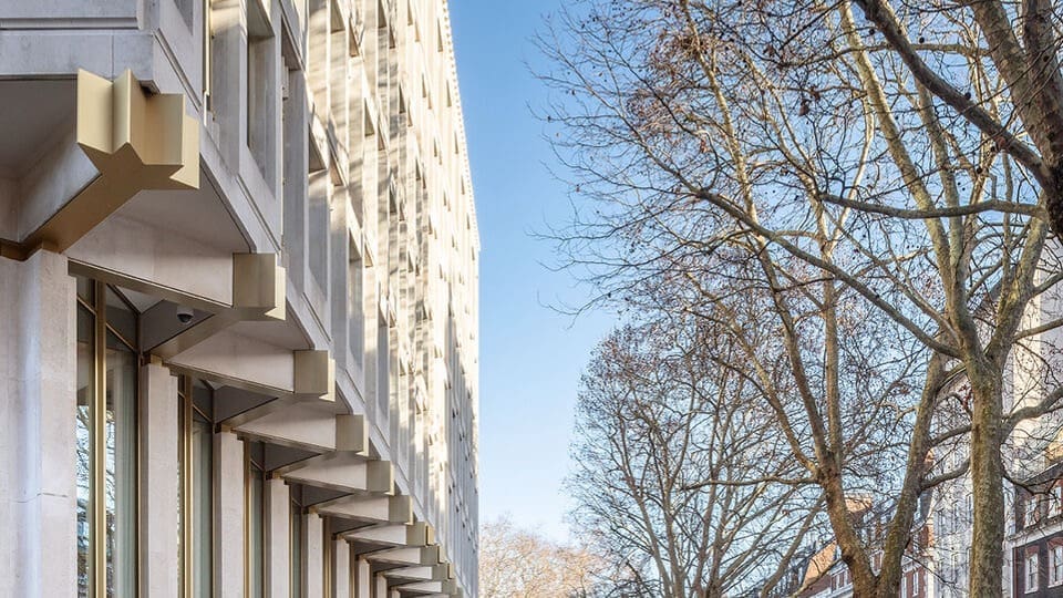 Set amid the lush plane trees of Grosvenor Square, the building presents a striking presence. Sunlight plays across the gold-anodised steel mullions and sculpted stone façades, revealing the depth and character of Saarinen’s original design.