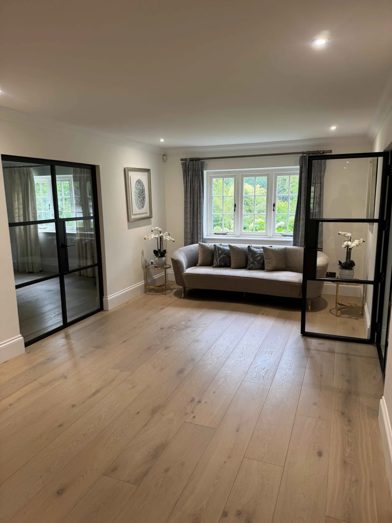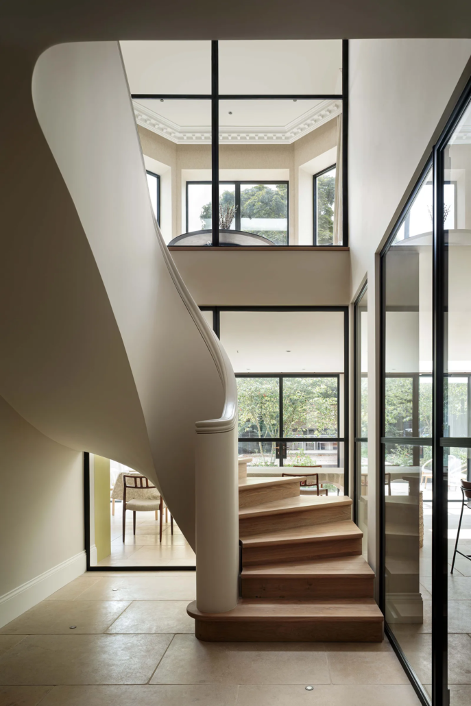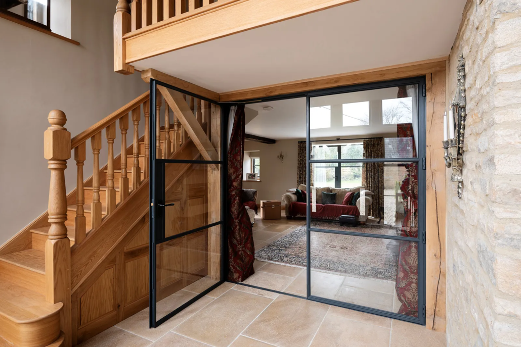 This exquisite project features solid oak and steel doors that open into a breathtaking entrance hall, where a handcrafted oak staircase is paired seamlessly with elegant steel double doors leading into the home’s main reception space. Across the rear elevation, a series of slim-sightline steel doors frame uninterrupted views of the garden, extending out toward the surrounding paddocks and countryside.