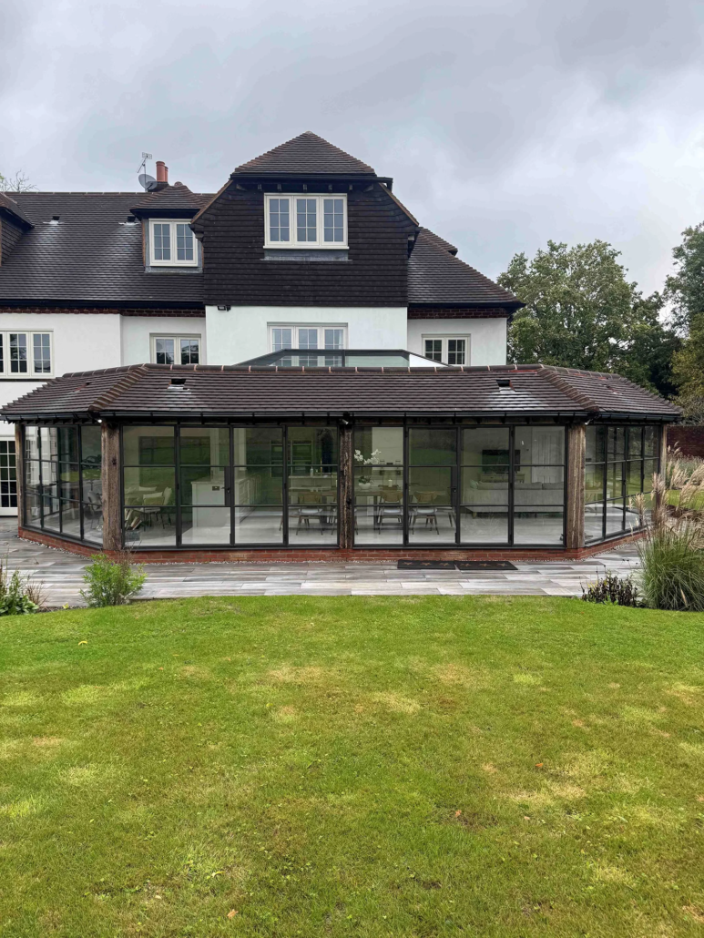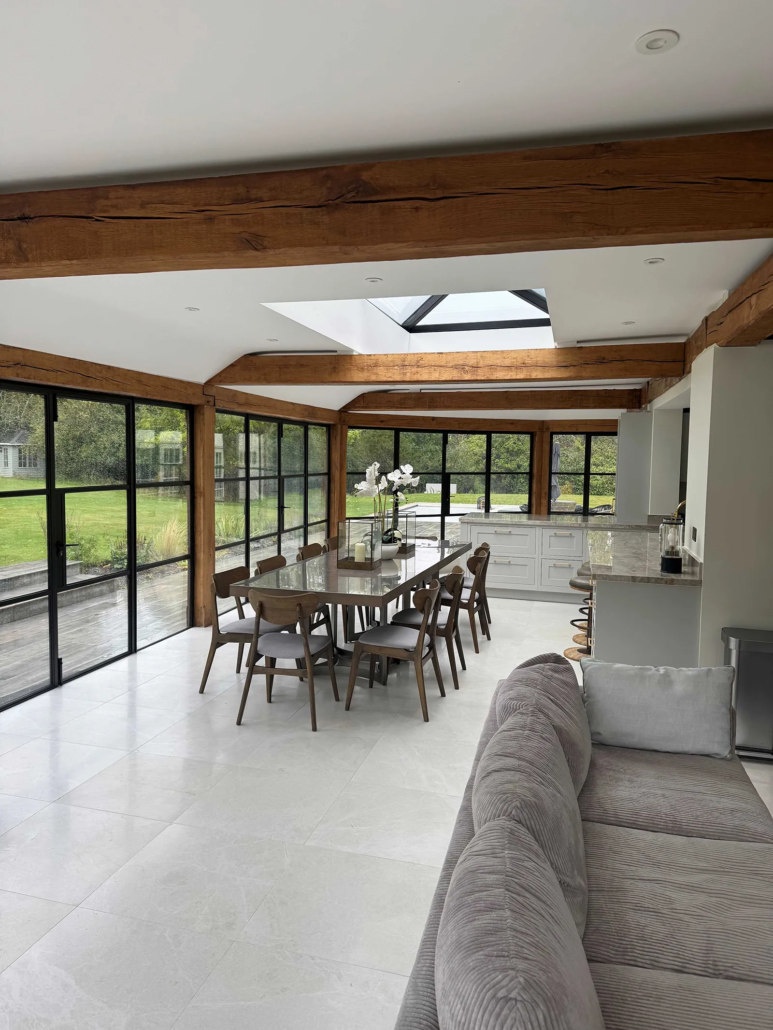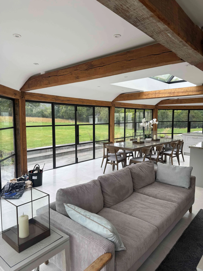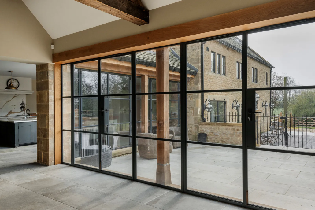 Govette Windows Ltd was appointed to design and install new steel replacement door screens where the original oak doors were no longer serviceable. These bespoke screens were carefully developed to integrate within the existing oak structure while significantly increasing the amount of natural light entering the property.