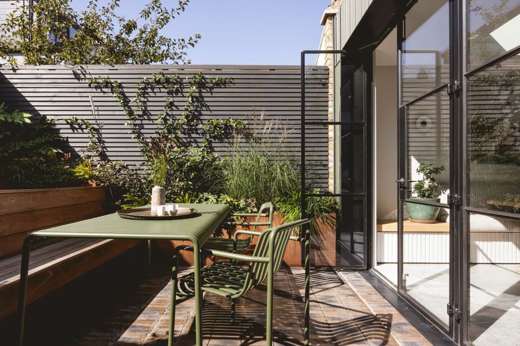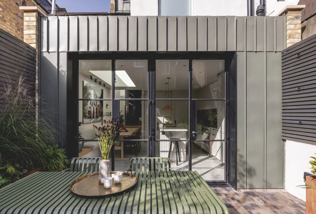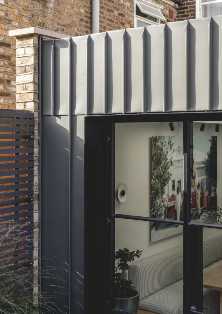 A defining element is the integration of these Fabco steel glazed doors, which provide a contemporary industrial edge while respecting the proportions of the original period frontage. The dark steel frames and the rhythmic patterning of the soft green zinc cladding responds to the tightly knit terrace context. A visual representation of the house jostling for space and a motif that reappears throughout the house, from the crafted stairs to a bespoke made Amy Kent rug.