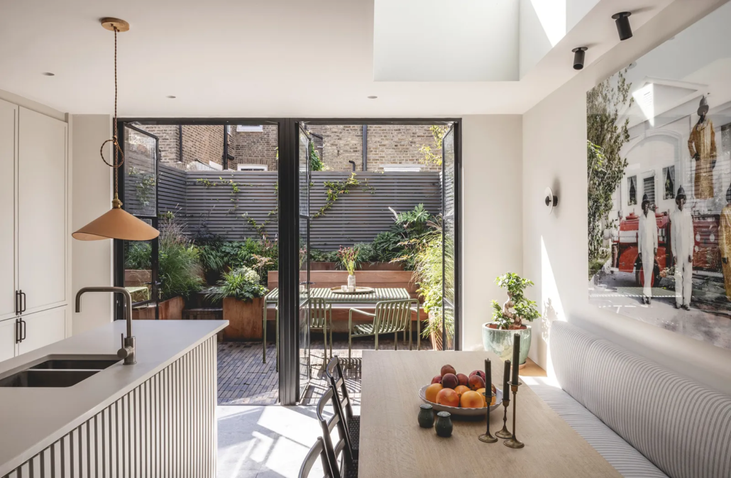 The craftsmanship is evident in the arched silhouette of the steel frames, which echo the design language of the original rear sash windows. On the kitchen side, the geometry shifts to a squared profile in order to align with the surrounding cabinetry and window proportions.